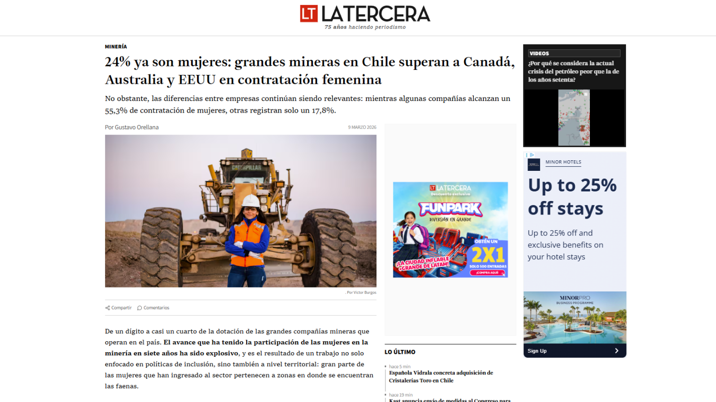 Así lo indica el informe Monitoreo de Indicadores de Género 2026 de la Alianza CCM-Eleva -dependiente del gremio Consejo Minero y la Fundación Chile-, que cifró en un 24% la participación femenina en el grupo de las mayores empresas de la industria, lo que posiciona a Chile en niveles de liderazgo entre sus competidores.
