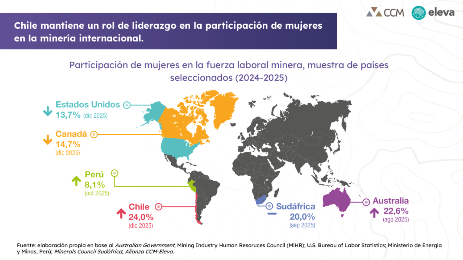 Parte de los compromisos de la Alianza CCM-Eleva es realizar semestralmente un «Monitoreo de Indicadores» vinculados a temáticas de Género (participación de mujeres) y Empleo Local, entregando datos actualizados para que las empresas mineras puedan evaluar sus avances respecto a los promedios del sector, en materia de contratación de mujeres y de trabajadores locales.