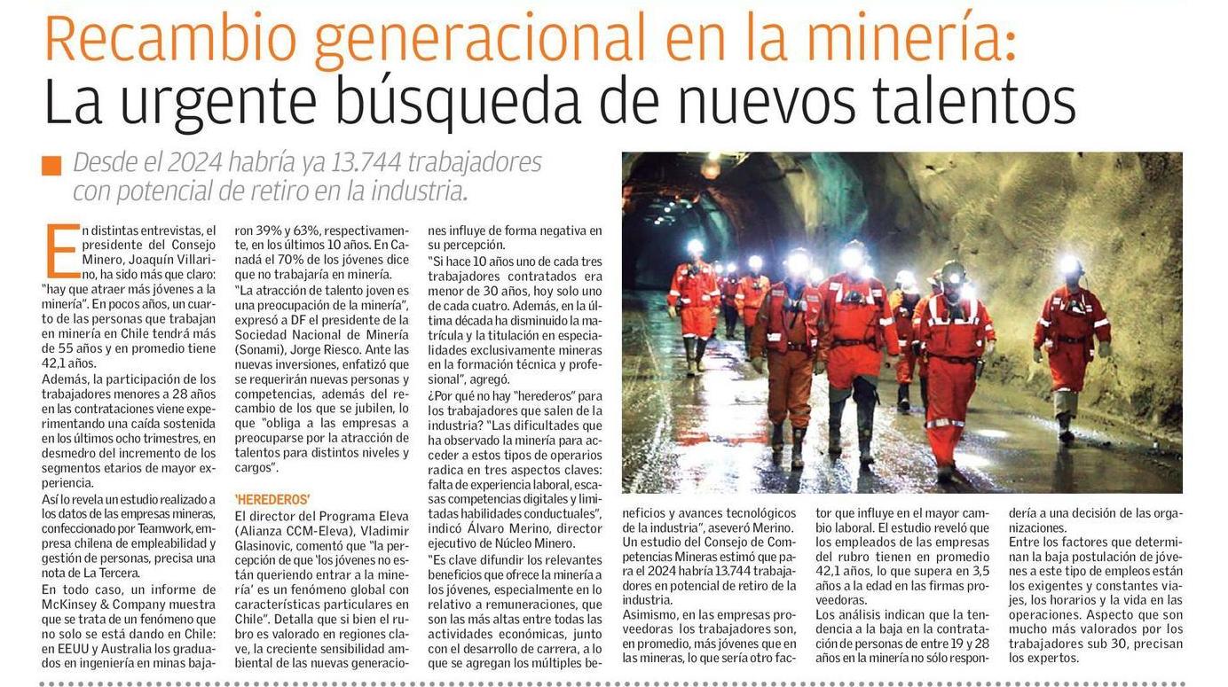 “Es clave difundir los relevantes beneficios que ofrece la minería a los jóvenes, especialmente en lo relativo a remuneraciones, que están a los más altos entre todas las industrias existentes, junto con el desarrollo de carrera, a lo que se agregan los múltiples beneficios y avances tecnológicos de la industria”, aseveró Merino. Un estudio del Consejo de Competencias Mineras estimó que para el 2024 habría 13.744 trabajadores en potencial de retiro de la industria.